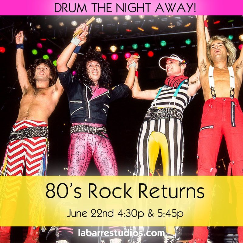 Don’t forget, 80’s Rock Returns. Our next Drumming party is Friday, June 22nd, 4:30pm & 5:45pm. Costumes are not only encouraged but respected.